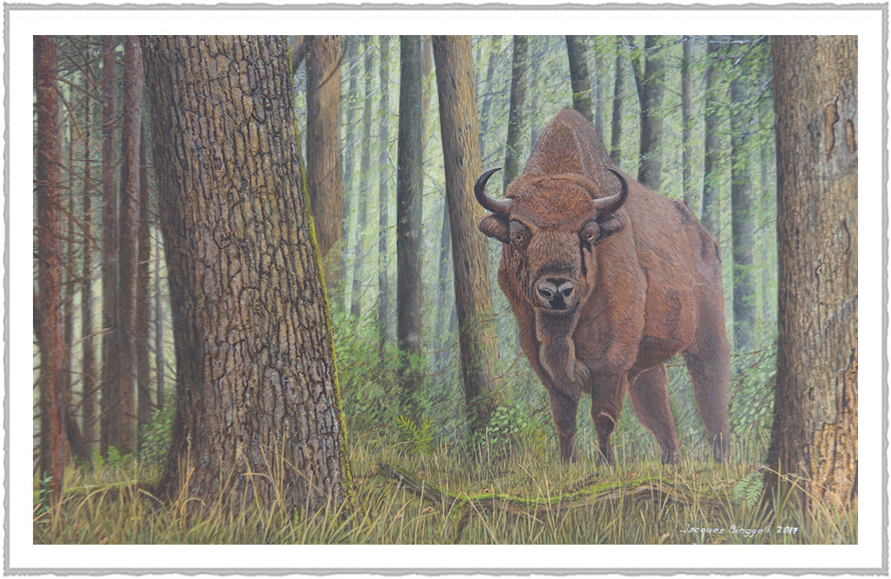 ![]() | Bison d'Europe Impressionnant face-à-face avec un mâle en rut, dans les brumes matinales de la forêt primaire. Observation: Acrylique sur panneau |