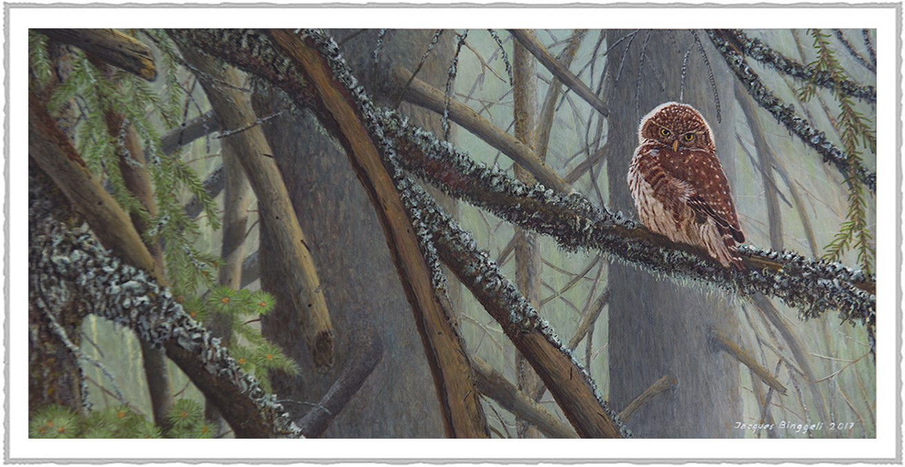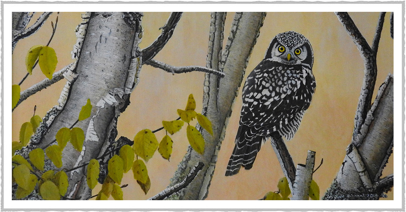 ![]() | Chouette épervière ou Epervière boréale De son perchoir, elle a une vue imprenable sur les marais, où en fin de journée viennent se nourrir les élans. Acrylique sur panneau |