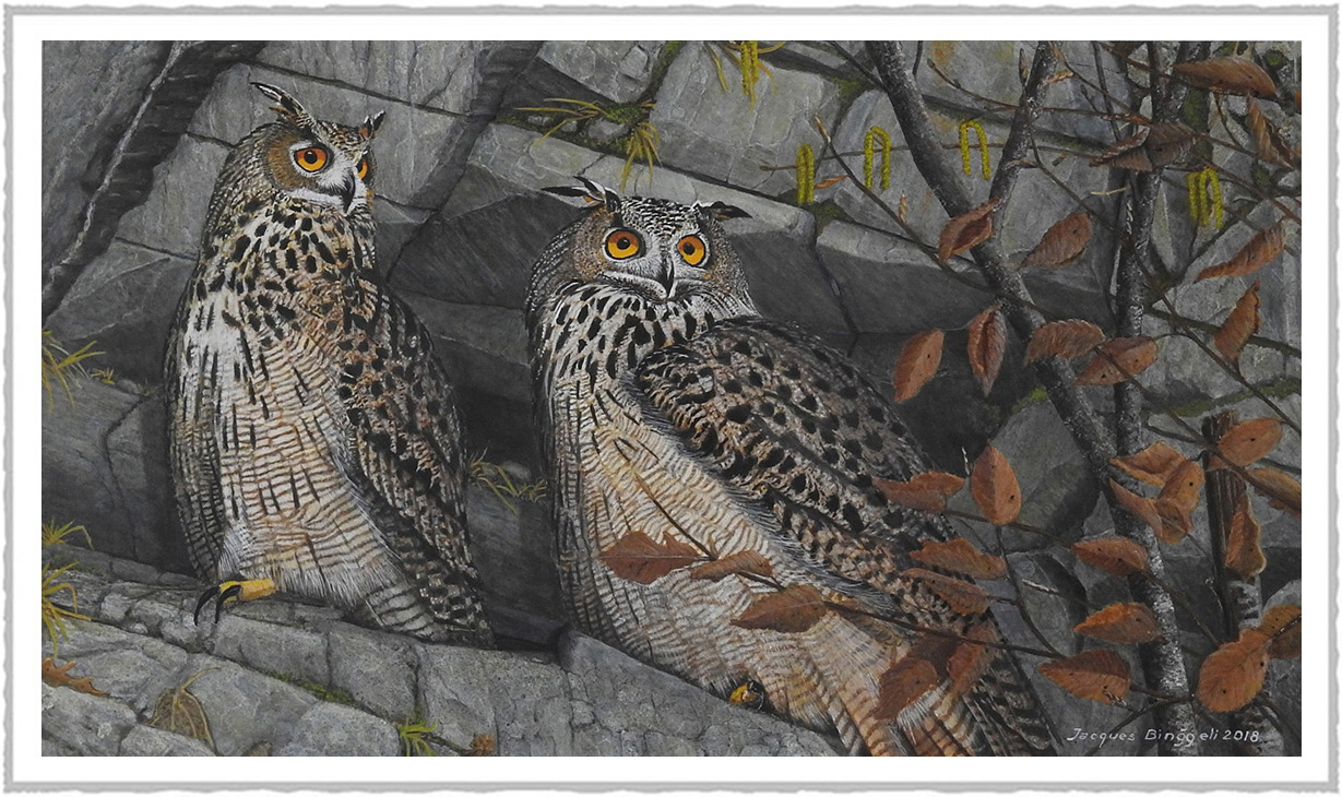 Face au soleil couchant, les grands-ducs s'animent. Ils vont bientôt partir pour leurs virées nocturnes, et nous sommes aux premières loges! Observation: Acrylique sur panneau |
