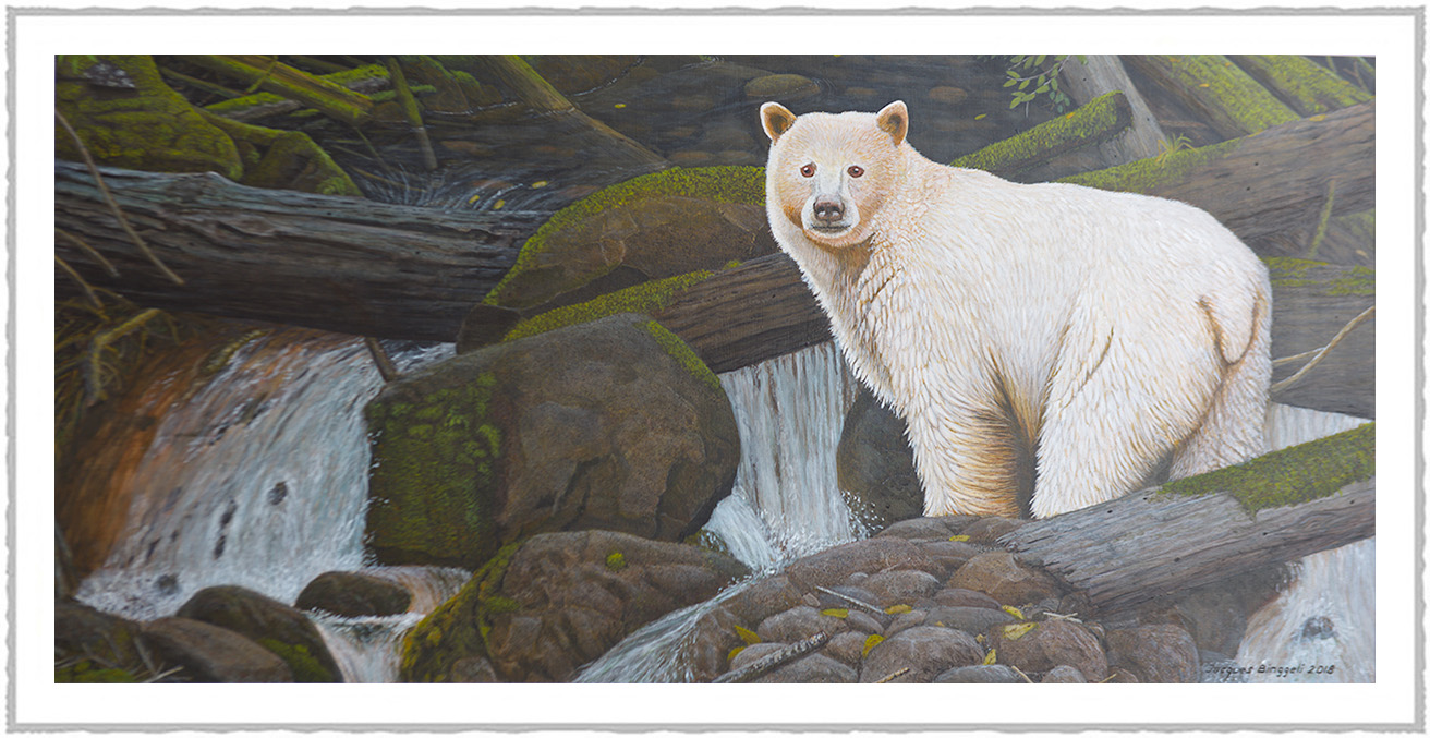 ![]() | Ours kermode* Quel privilège de rencontrer l'ours Esprit, fantôme de l'extraordinaire forêt pluviale du Grand ours! Observation: *Ours noirs atteints de leucisme ou leucistisme. Acrylique |