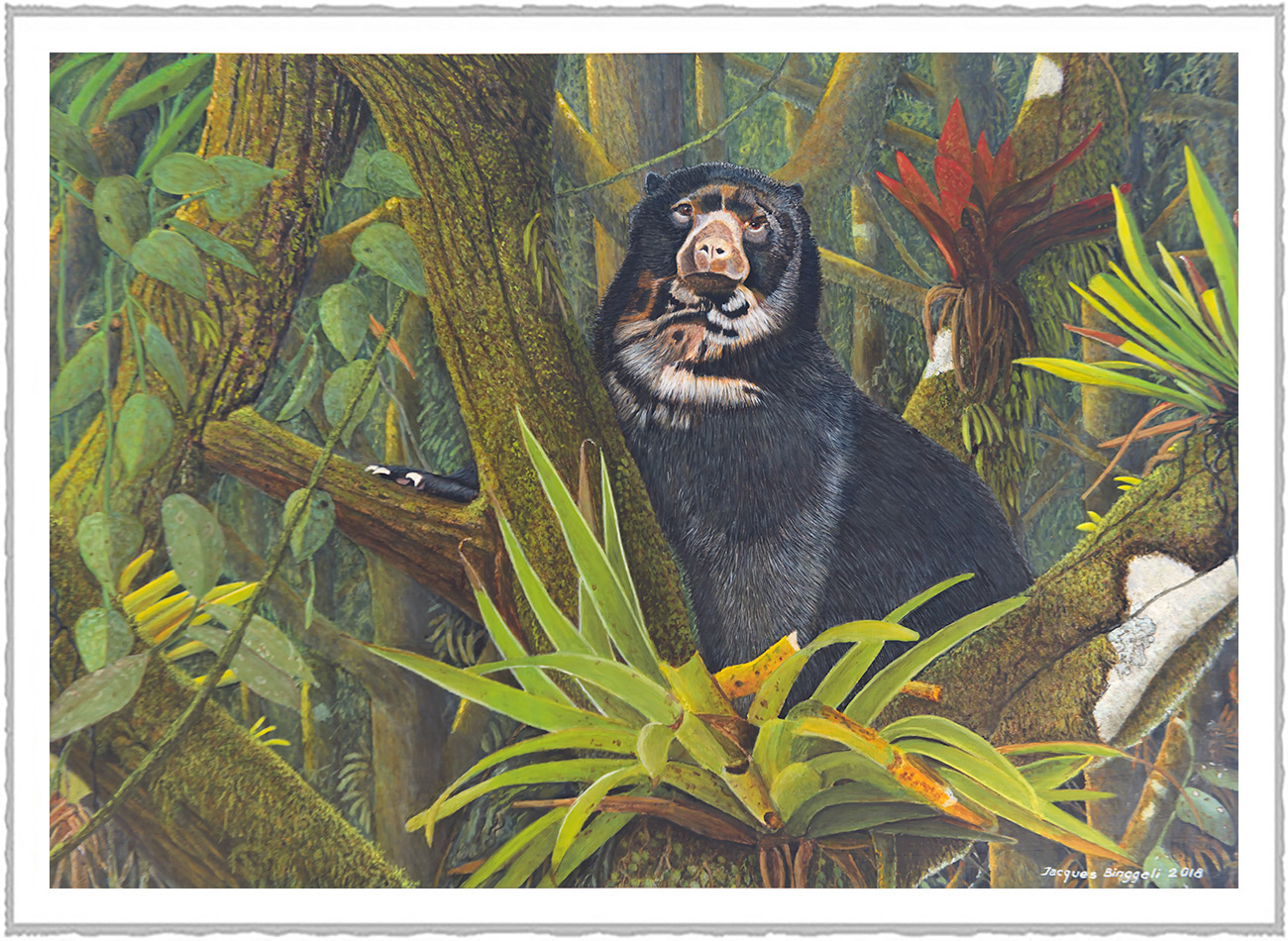 ![]() | Ours à lunettes Cette abeille de 180 kg se délecte des broméliacées épiphytes et autres plantes caractéristiques de la zone des brouillards de la Cordillère des Andes colombienne, où nous l'avons suivi à la trace dans la Sierra Nevada del Cocuy et les Páramos de la Russia. Observation: Acrylique sur panneau |