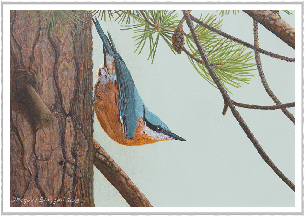 ![]() | Sittelle torchepot Tête en bas, de haut en bas, de bas en haut ou en spirale, la petite maçonne arpente sans relache les troncs du petit bois. Acrylique sur panneau 29 x 20 |