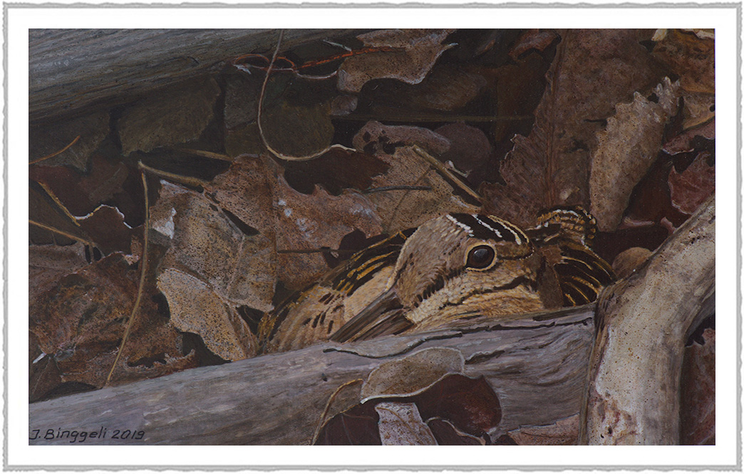 ![]() | Bécasse des bois Tapie dans le sous-bois, couleur de feuilles mortes, elle espérait passer inaperçue, quand les reflets lumineux de son œil l'ont trahie. Observation: