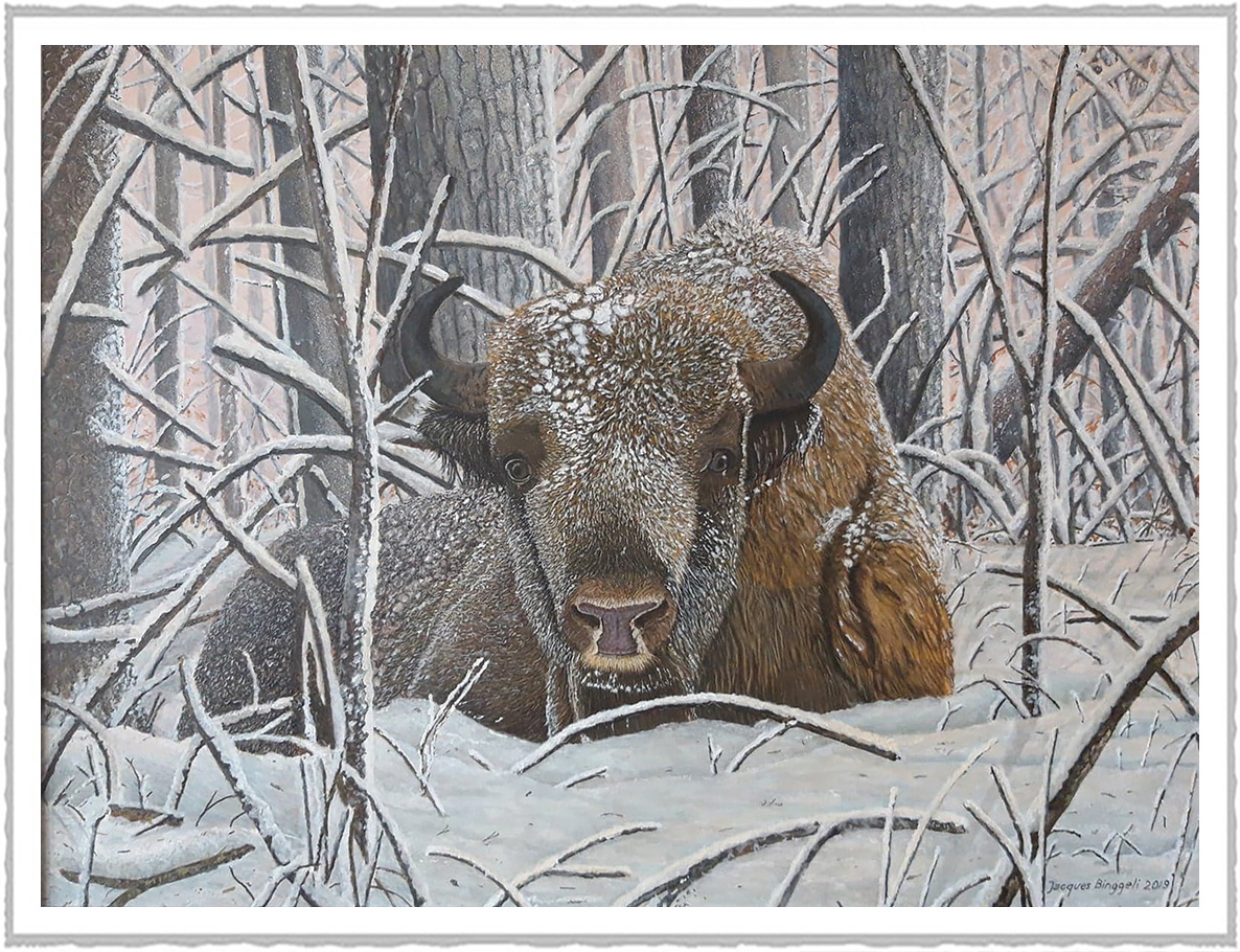 ![]() | Bison d'Europe Petit matin glacial, dans la mythique forêt primaire. Observation: Acrylique sur panneau 68 x 47 |