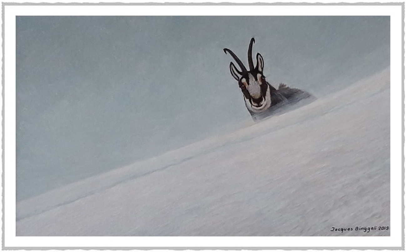 ![]() | Chamois Dans la tempête, émouvent face à face de fin de journée. Acrylique sur panneau 64 x 44 |