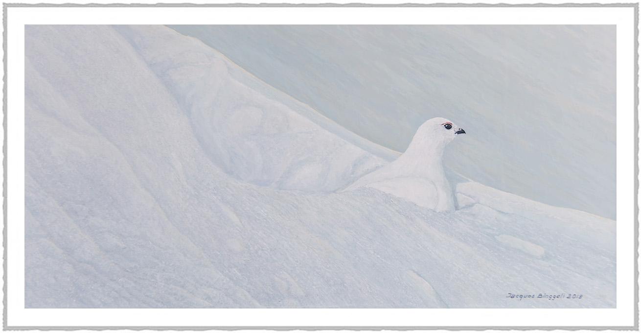 ![]() | Lagopède alpin Ton sur ton, immobiles, les lagopèdes se fondent dans l’immensité blanche des massifs enneigés. Acrylique sur panneau 75 x 45 |