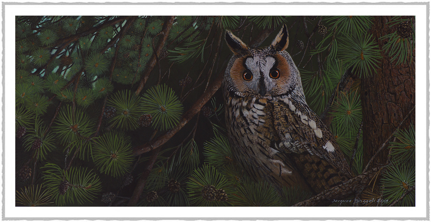 ![]() | Hibou moyen-duc Difficile à repérer dans le dortoir touffu des cônifères.