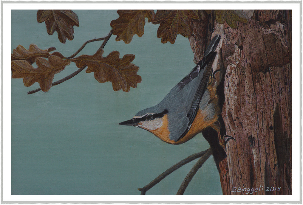 ![]() | Sittelle torchepot Un petit air mutin pour la voyageuse ardoisée, qui pacourt sans relâche la ramure du grand-chêne. Acrylique sur panneau 40 x 30 |