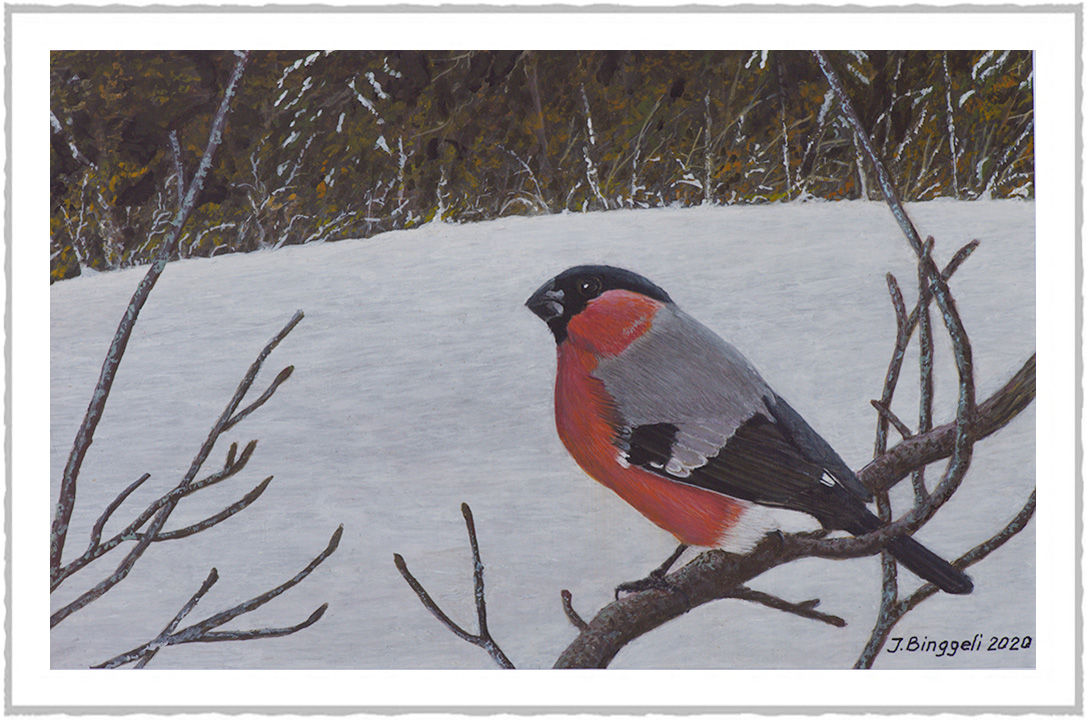![]() | Bouvreuil pivoine Fleur de l'hiver, un brin mélancolique sous la grise couverture nuageuse. Acrylique sur panneau 40 x 30 |