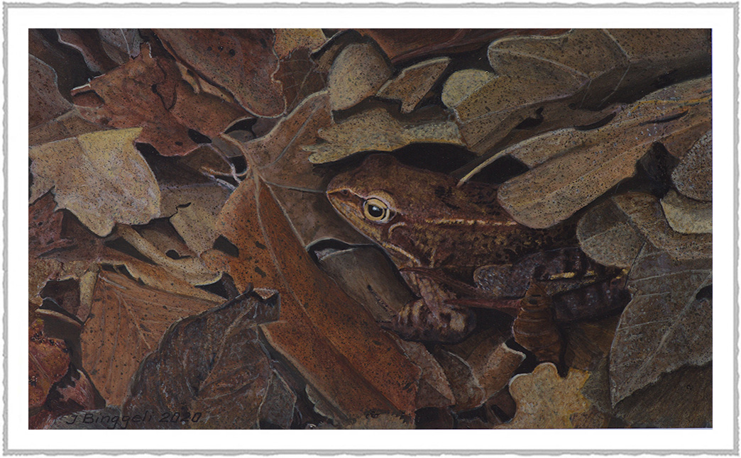![]() | Grenouille rousse Elle se fond à merveille dans la litière forestière, qui lui assure gîte et couvert. Observation: Acrylique sur panneau 37 x 25 |