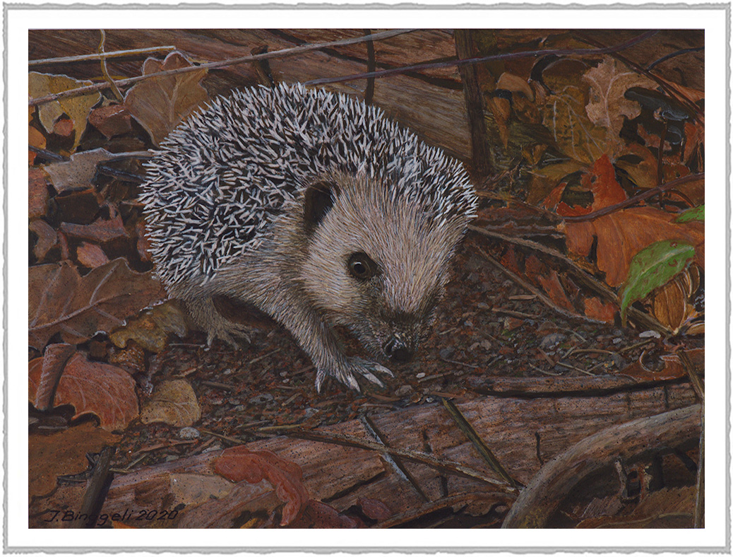 ![]() | Hérisson commun Dans un sous-bois, ce jeune hérisson tente l'aventure à l'écart du groupe familial. Acrylique sur panneau 40 x 30 |