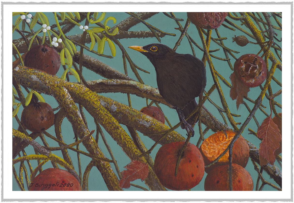 Au coeur de l'hiver, les pommes blettes du vieux verger sont pour lui un trésor inégalable. Acrylique sur panneau 42 x 32 |
