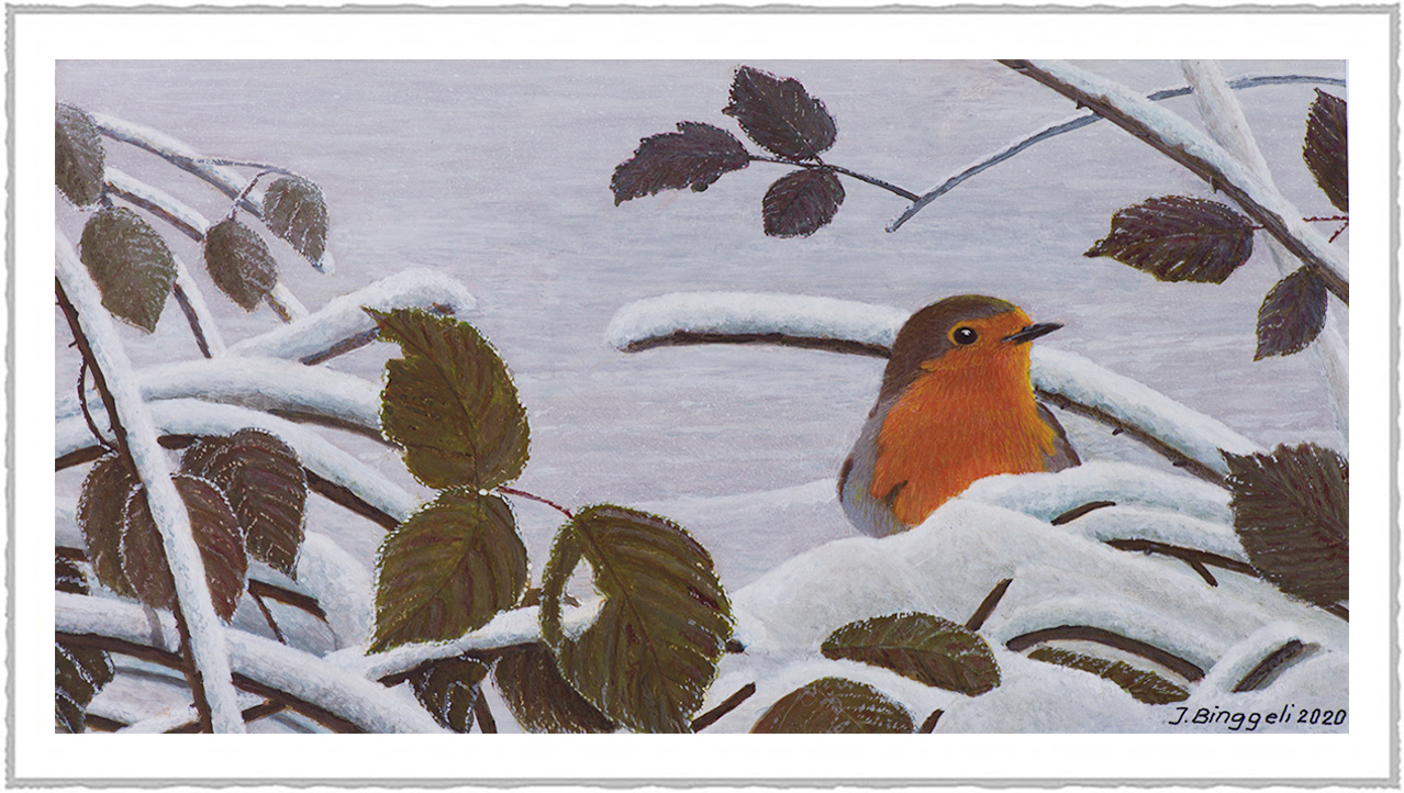 ![]() | Rouge-gorge familier L’œil vif, alerte, ce compagnon de nos balades hivernales cherche fortune dans le roncier. Acrylique sur panneau 52 x 34 |