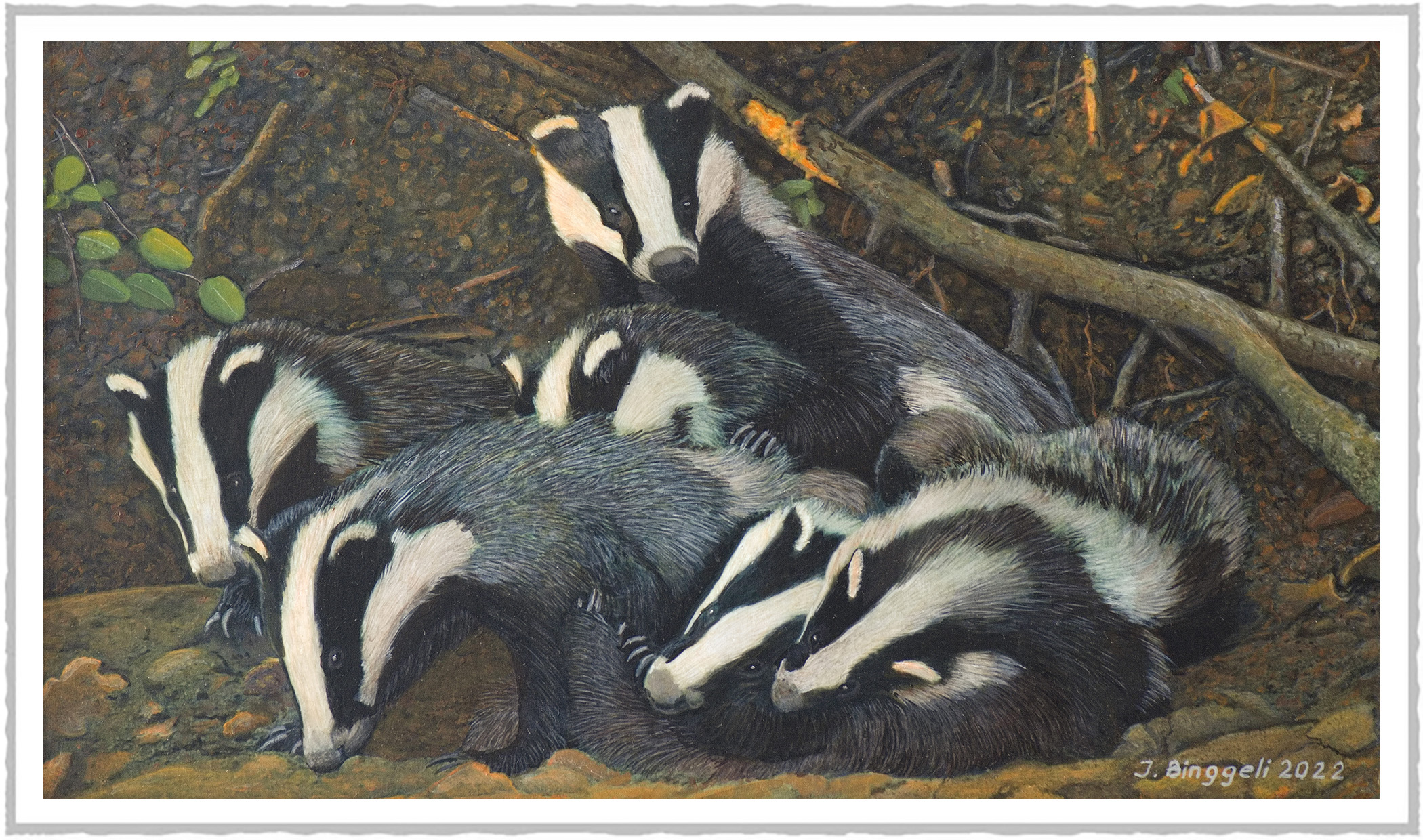 ![]() | Blaireau Meles meles Aux dernières lueurs du jour, Juste après le coucher du soleil, ils pointent leur museau à l'entrée de la tanière, et si tout est calme s'installent pour quelques jeux et une toilette appliquée.