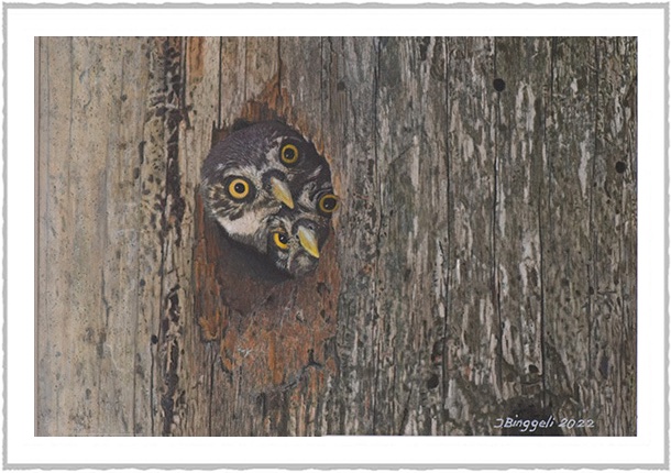 ![]() | Chevêchette d'Europe Proches de l'envol, ces jeunes chevêchettes sont avides de découvrir leur environnement extérieur. Observation: Acrylique sur panneau 34 x 44 |