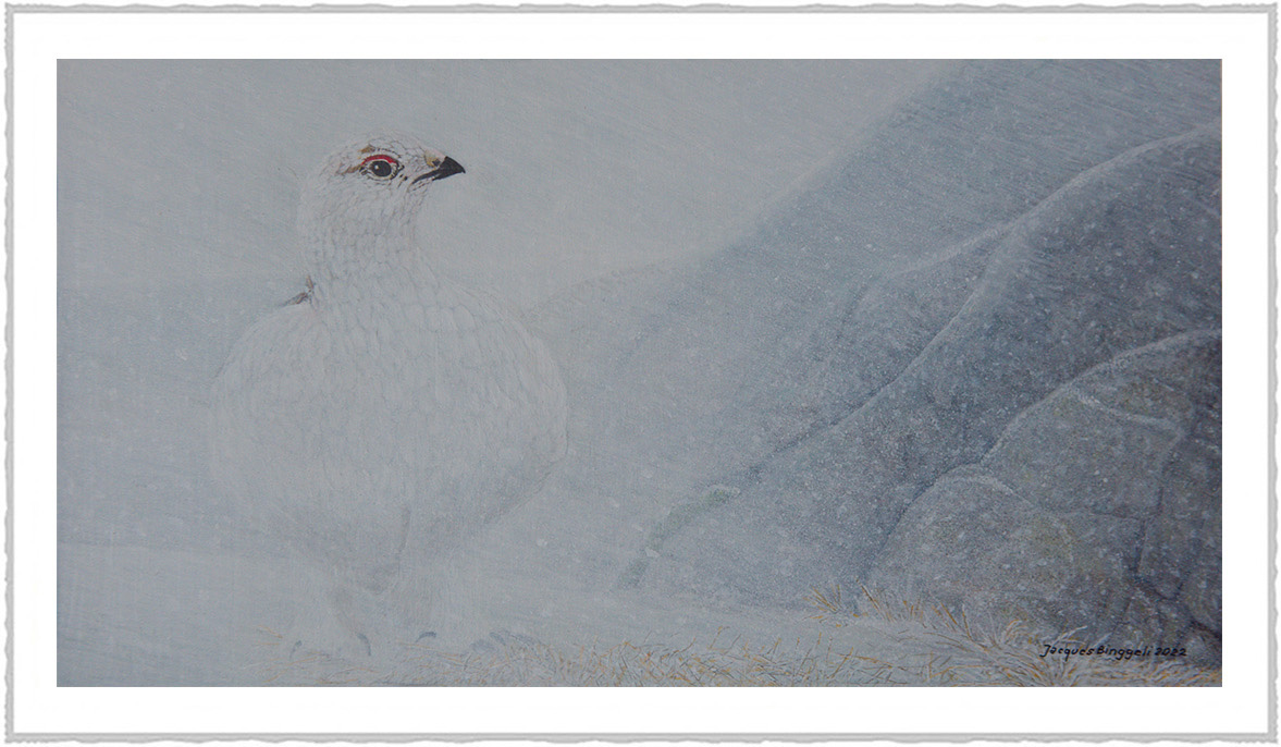 ![]() | Lagopède alpin Noyé dans la tempête, il se fige pour un face à face avec l'artiste.