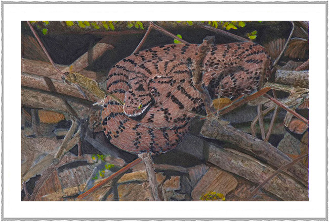 ![]() | Vipère aspic Ton sur ton, immobiles, elle se fond dans les broussailles d'une haie. Acrylique sur panneau 24 x 32 |