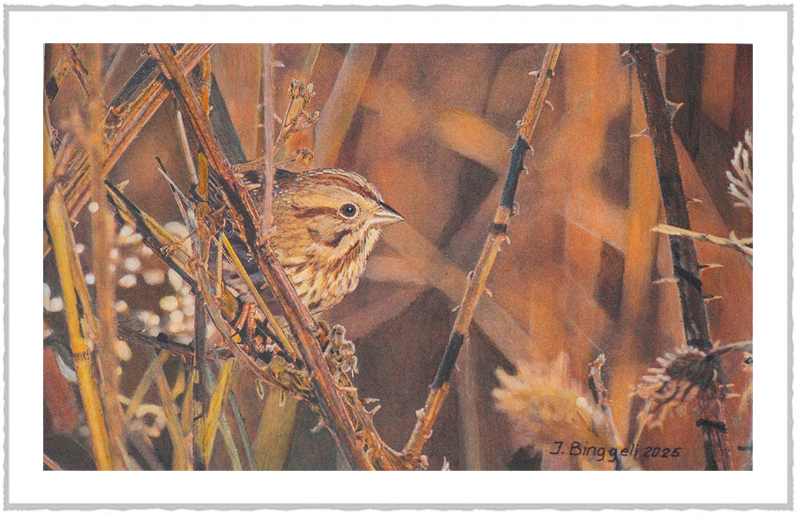 ![]() | Bruant des roseaux Discret, parmi les camaïeux d'ocres de la roselière hivernale.