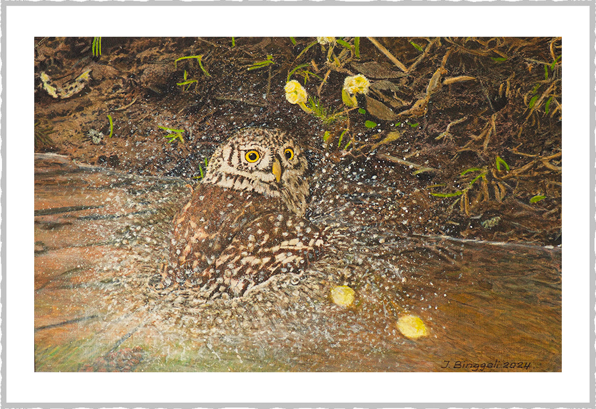 ![]() | Chevêchette d'Europe Au bain dans une ornière du chemin, elle plonge et relève brusquement la tête, l'eau ruisselle tout au long de son dos, elle s'ébroue, asperge alentour de mille diamants. Observation: Jura vaudois - 2023 Acrylique sur panneau 43 x 32 |