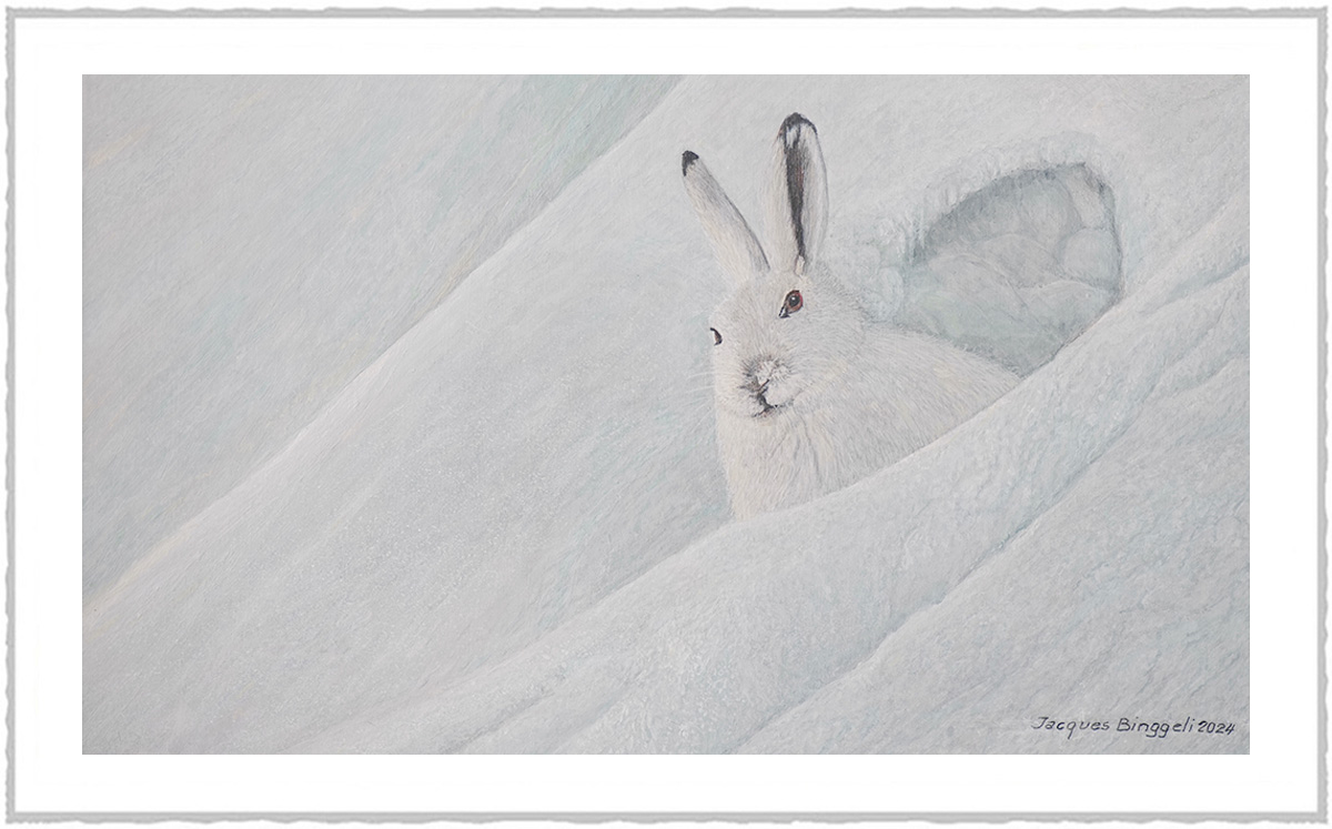 ![]() | Lièvre variable Immobile dans l'immensité immaculée, il passait inapperçu, quand un mouvement au sortir de son abrit neigeux l'a trahi. Observation: Acrylique sur panneau 53 x 36 |