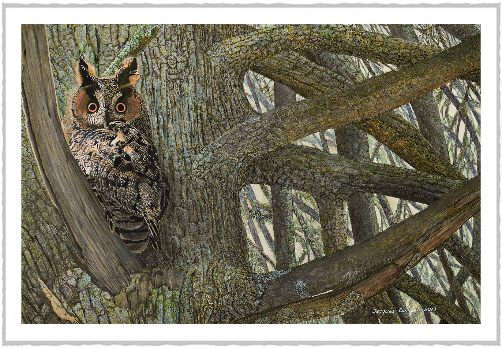 ![]() | Moyen-duc Asio otus Un rayon de lune pour ce moyen-duc du bas Jura vaudois! Acrylique sur panneau 70 x 50 |