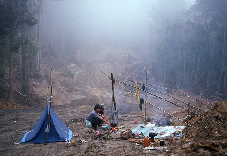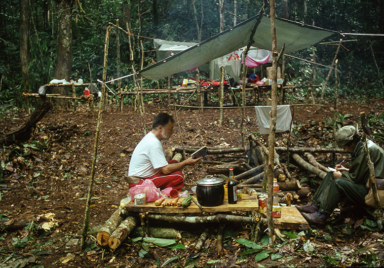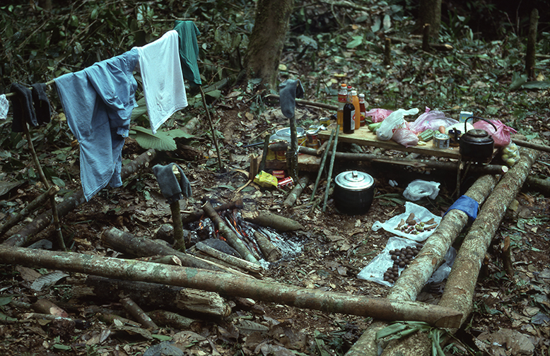 ![]() Petit matin au bout de la route. Bivouac de Danny Chew, en conversation avec un Lundayeh. ![]() Coin cuisine et séchoir. |