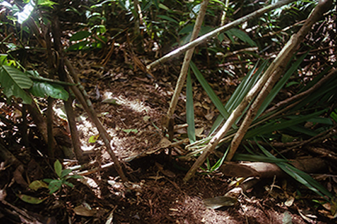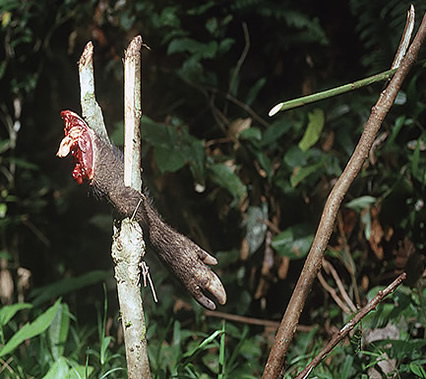 pour les rapprocher du village de destination ou les remettre en main propre s’ils savent pouvoir le faire. Un excellent service postal ! Plus loin,une patte de sanglier coincée dans la fourche d’un piquet indique ![]() ![]() ![]() que le reste entier de l’animal est dans les environs. Nos compagnons trouvent rapidement un amas de bâtonnets, dont la disposition permet de localiser la position exacte et le village à qui il est destiné. C’est pour nous ! Un des Lundayeh ajoute le sanglier* à la pyramide de sa charge. |