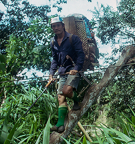 forêt. Ces simples et si sincères marques de bienvenue nous vont droit au cœur. Au cours de notre séjour, nous découvrirons que le mode de vie naturel de nos hôtes est similaire à celui des indigènes rencontrés au Sarawak par Bruno Manser. D'ailleurs, ils vivent encore principalement de chasse, de pêche et de cueillette, ils cultivent un peu de riz dans des clairières près de la rivière et élèvent quelques poules. Depuis toujours ils écoutent et observent la nature dont ils connaissent les secrets et suivent les enseignements. Au lendemain de la si émouvante soirée, partagée avec nos nouveaux amis, nous quittons le village pour nous installer en forêt. Notre équipement est transporté par les Lundayeh qui construiront notre campement. Une bande d’enfants, magnifiques avec leurs cheveux d’ébène, de fantastiques yeux noirs à peine bridés, et des sourires éclatants dans de douces faces rondes, nous escorte un bout de chemin. Et puis, seul un garçonnet au caractère de chef déjà bien marqué, et une fillette, aussi belle qu’une princesse des légendes anciennes, nous accompagnent jusqu'à un pont suspendu. A demi démantelé, se balançant à huit mètres au dessus de l’eau, il ne nous inspire aucune confiance ! Heureusement, tout le monde arrive saint et sauf sur la rive opposée. Trois heures plus tard, nos amis trouvent un lieu propice à l’établissement du camp. En un temps record, ils créent une clairière dans le méandre choisi d’une petite rivière. Leur efficacité et leur dextérité ne sont rien en comparaison avec ce que nous connaissons déjà ! Près de l’eau, ils organisent le foyer pour cuisiner, l’étendage et le ‘salon où l’on cause’ qui nous réunira chaque soir pour |