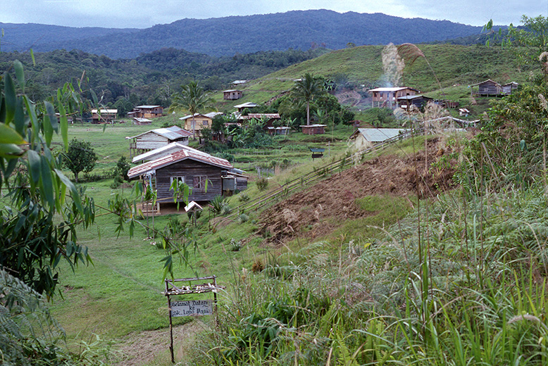 Situé à la jonction de deux rivières, le village de ‘Long Pasia’ compte une dizaine de maisons de bois, construites sur pilotis autour d’une vaste clairière dont le centre se transforme en étang à la saison des pluies. Comme la maison des visiteurs est momentanément squattée par un énorme nid de guêpes, un des chefs de la communauté nous offre l’hospitalité de sa demeure. L’honneur de nous offrir à boire est réservé à sa mère, vieille femme tatouée aux souvenirs passionnants. Elle nous propose de l’eau bouillie, chaude ou froide car leur provision de thé est épuisée. De son côté, la maîtresse de maison nous prépare une couche ‘confortable’ composée d’une fine natte tressée, posée à même le sol, et d’une couverture; toutes deux confectionnées avec les produits de la